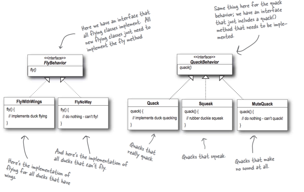 这样做以后,flyBehavior以及quackBehavior就和鸭子类分离出来了。既可以重用这部分代码,也可以新增新的behavior也不会影响到原有的代码。