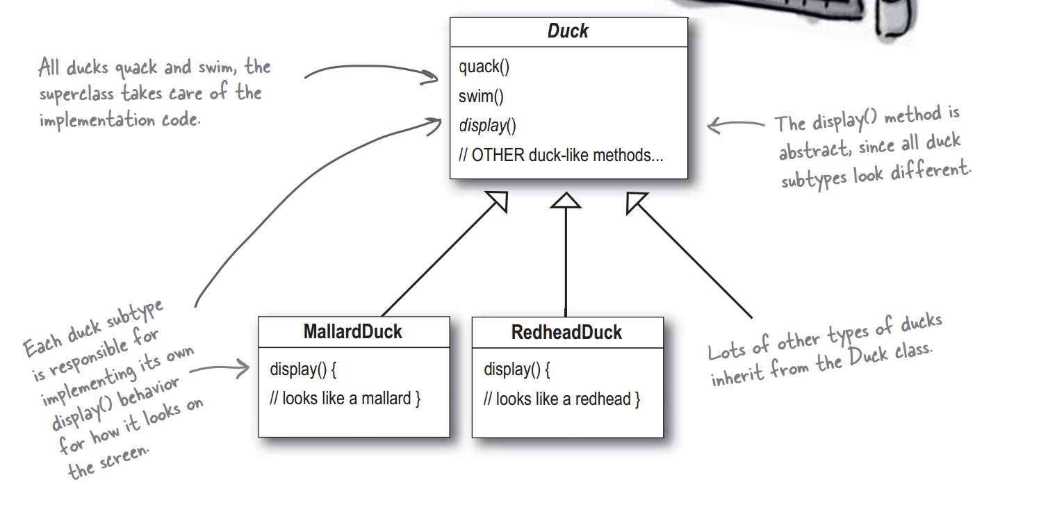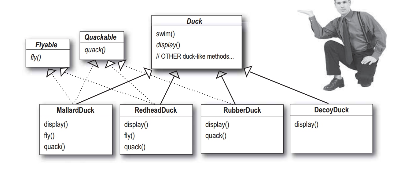 Joe:可是,如果以后我加入木头鸭(DecoyDuck)又会如何。木头呀不会飞也不会叫。 Joe认识到继承可能不是答案,因为他刚刚得知,接下来的几个月,游戏会有大的更新,至于怎么更新还没确定。鸭子的种类会越来越多。每当有新的鸭子子类出现,他就要被迫检查并可能需要覆盖fly()和quark()方法,看对不对,防止再闹笑话。