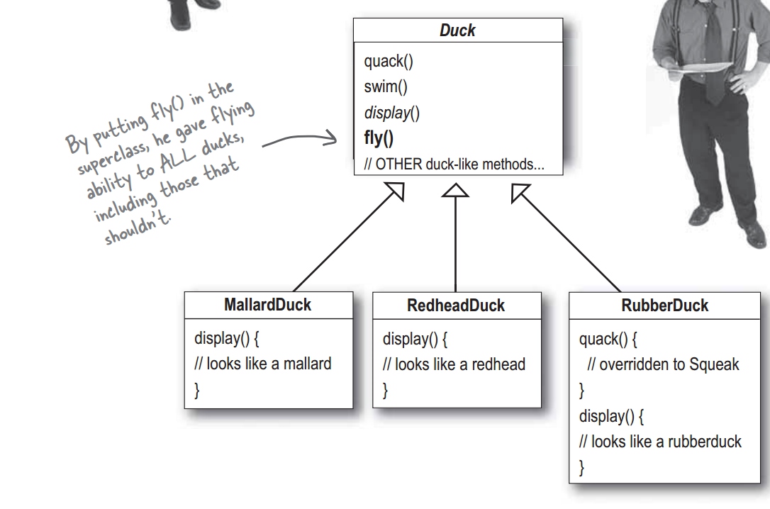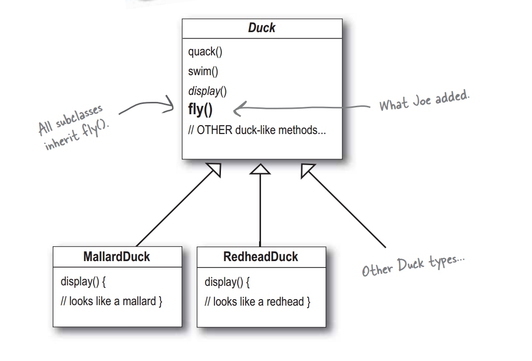Joe: 我只要在Duck类上加上fly()方法,然后所有的鸭子都会继承fly()方法。这是我大显身手展示OO的优越的时候了。